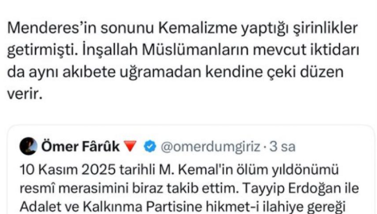 Bölükbaşı’nın, Cumhurbaşkanı Erdoğan ve mevcut hükümete yönelik “Menderes’in sonunu Kemalizme yaptığı şirinlikler getirmişti. İnşallah Müslümanların mevcut iktidarı da aynı akıbete uğramadan kendine çeki düzen verir” şeklindeki sözleri nedeniyle hakkında gözaltı kararı verildiği öğrenildi.