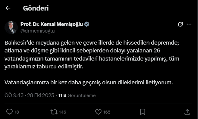 “Balıkesir’de meydana gelen ve çevre illerde de hissedilen depremde, doğrudan deprem kaynaklı bir yaralanma olmamıştır. Atlama ve düşme gibi ikincil sebeplerden kaynaklanan 19 yaralımızın 4’ü tedavilerinin tamamlanmasının ardından taburcu edilmiştir. Tüm yaralılarımızın genel sağlık durumları iyi olup, tedavileri hastanelerimizde devam etmektedir. Kendilerine acil şifalar diliyorum. Rabb’im ülkemizi ve milletimizi her türlü afetten muhafaza eylesin.” ifadelerini kullandı