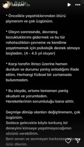 “Öncelikle yaşattıklarımdan ötürü pişmanım ve çok üzgünüm. Davranış bozukluklarımın farkına vardım ve bunun üzerine psikolojik destek almaya başladım. Ortamı yanlış okudum ve büyük bir hata yaptım. Geçmişi değiştiremeyeceğimin farkındayım ama aynı hatayı tekrarlamayacağımın sözünü verebilirim.”