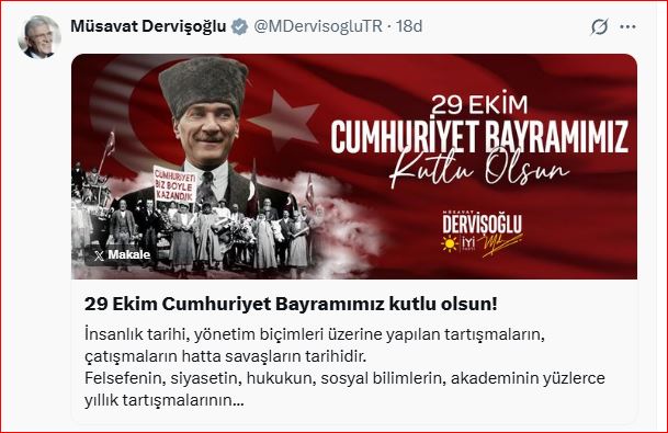 İYİ Parti Genel Başkanı Müsavat Dervişoğlu, Türkiye Cumhuriyeti’nin 102. kuruluş yıldönümü dolayısıyla yayımladığı mesajında Cumhuriyet’in insanlık tarihinin en büyük kazanımlarından biri olduğunu vurguladı.