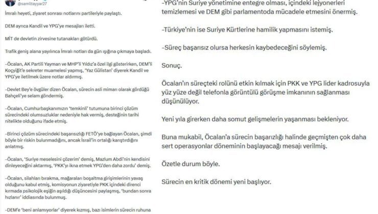 Kaldı ki İmralı notları, DEM üzerinden Murat Karayılan’dan Cemil Bayık’a, İlham Ahmed’den Mazlum Abdi’ye kadar birçok teröriste çoktan ulaştı.